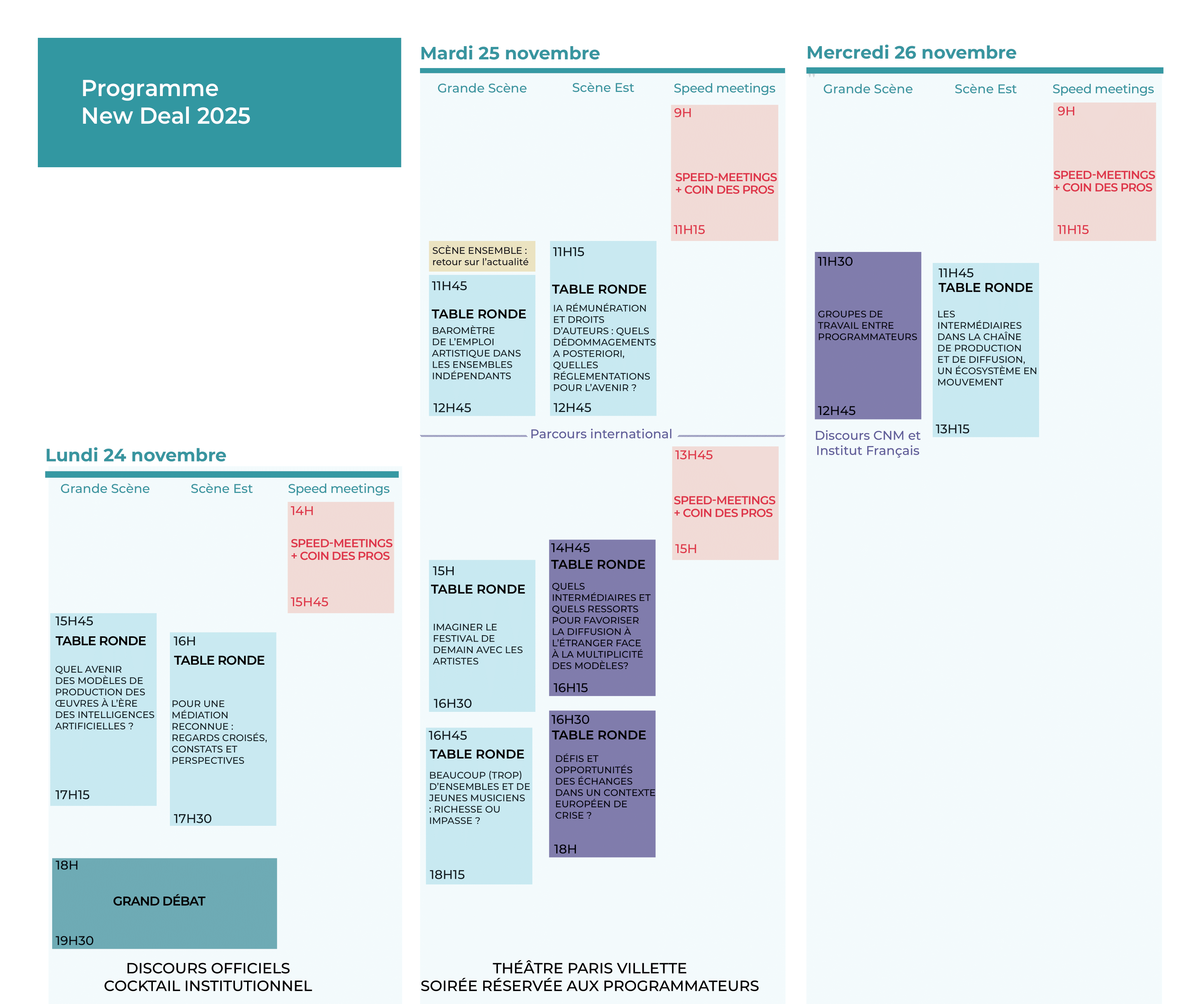 Pour sa 10ᵉ édition, New Deal poursuit sa mission : être un espace de rencontres, d’échanges et de réflexion autour des grands enjeux du secteur des musiques de patrimoine, de création, de jazz et improvisées.